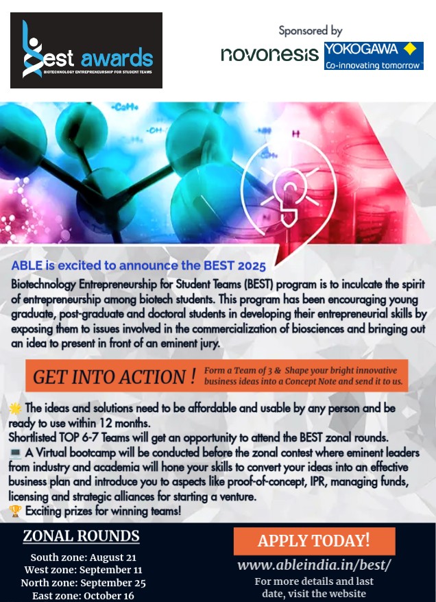 BEST Program: The Biotechnology Entrepreneurship for Student Teams (BEST) program aims to encourage student entrepreneurship. It is open to final-year graduate, post-graduate, and doctoral biotech students. Participants will receive broad topics for innovative ideas well in advance. Each participating team will consist of three students from different colleges, presenting their initial ideas to a jury in a closed conference room. The ideas will be kept confidential. The event will be held across all four regions of India. The top two winners from each region will be awarded cash prizes. This initiative will help student teams better understand the challenges in commercialization, regulatory, and patent processes, boosting their motivation to pursue entrepreneurial ventures in biotechnology. More details are available on the BEST website: www.ableindia.in/best.
